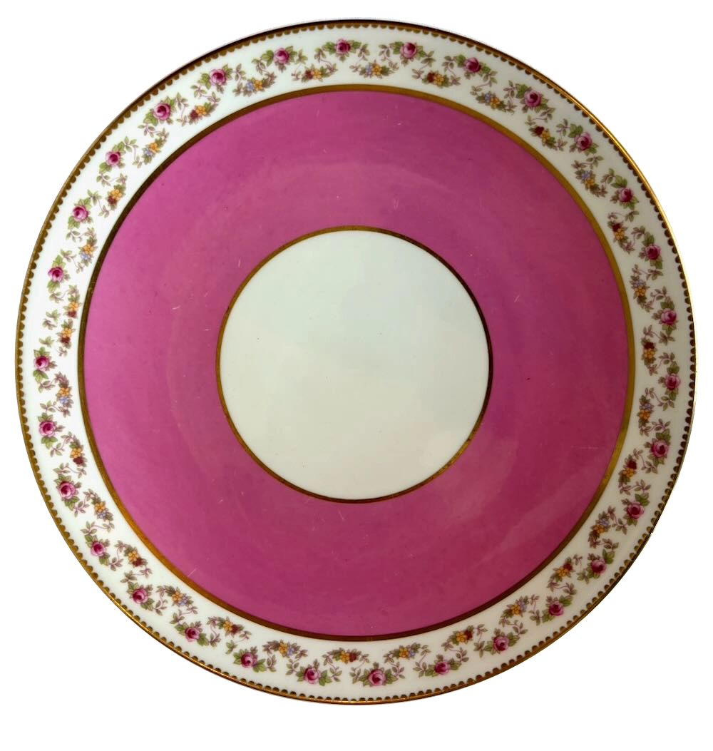 The plate is defined by its rich rose-pink ground, forming a wide band that draws the eye inward while creating a striking contrast against the surrounding border. Encircling this field is a finely detailed floral garland, composed of small blossoms in soft reds, yellows, and greens, delicately arranged on a warm ivory ground. The entire composition is framed with hand-applied gilt accents, adding a subtle luminosity and emphasizing the precision of the form.