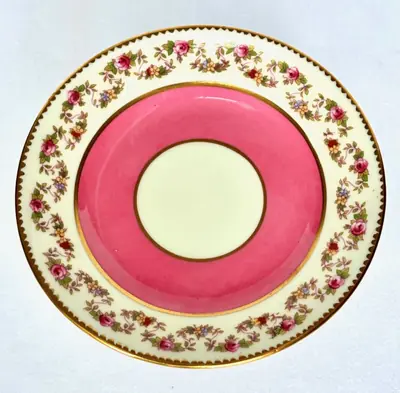 Good antique condition consistent with age. The porcelain remains clean, with clear floral detail and a soft, even tone to the pink band. Gilt trim shows light wear typical of use. Minor manufacturing variations may be present, as expected in early bone china.