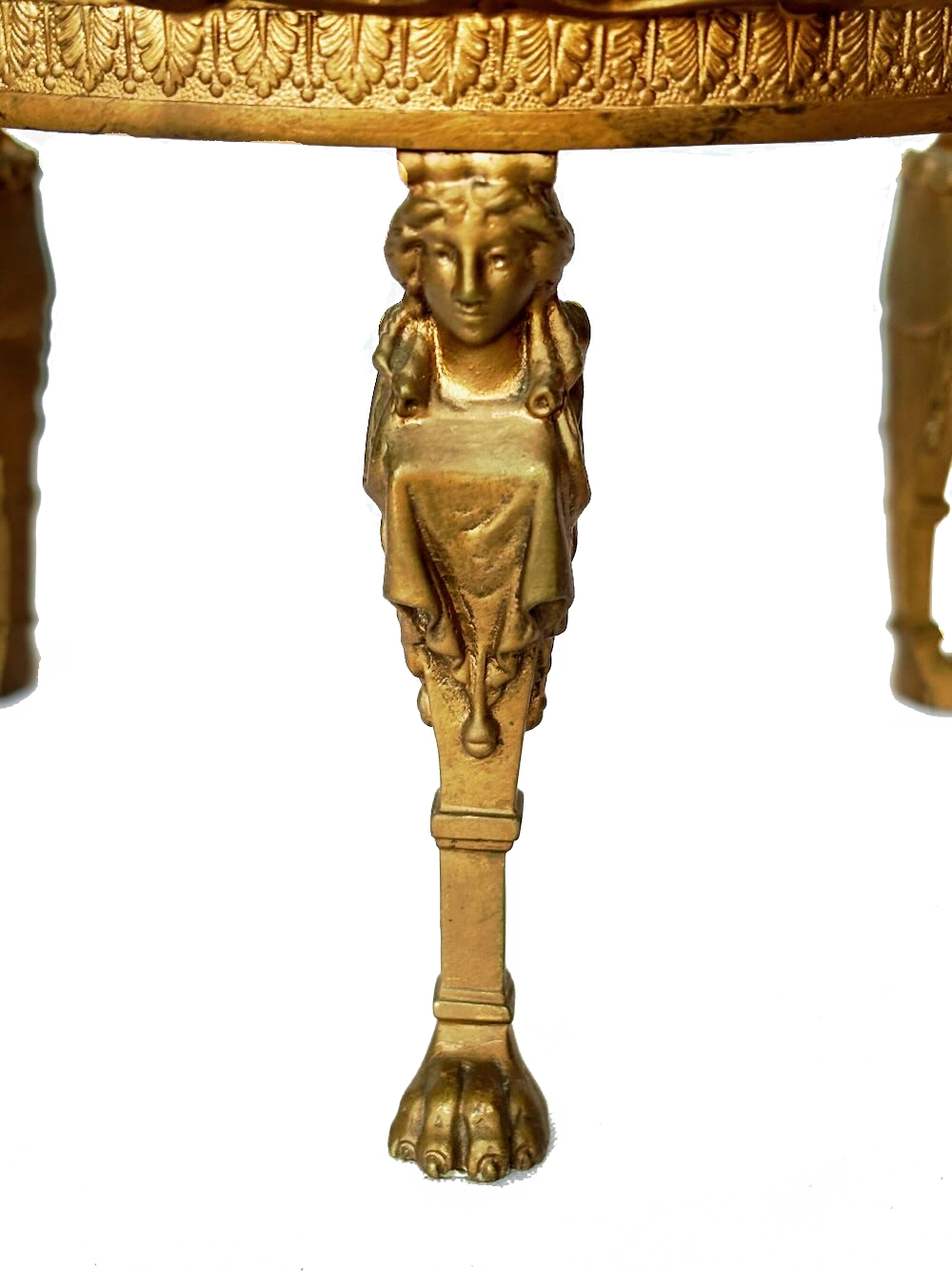 The stand is supported by three cast gilt bronze caryatid figures, each depicted as a draped classical female form with carefully modeled facial features and stylized hair. The figures transition into squared shafts and terminate in lion-paw feet, a defining motif of Empire design and one of its most recognizable ornamental elements.