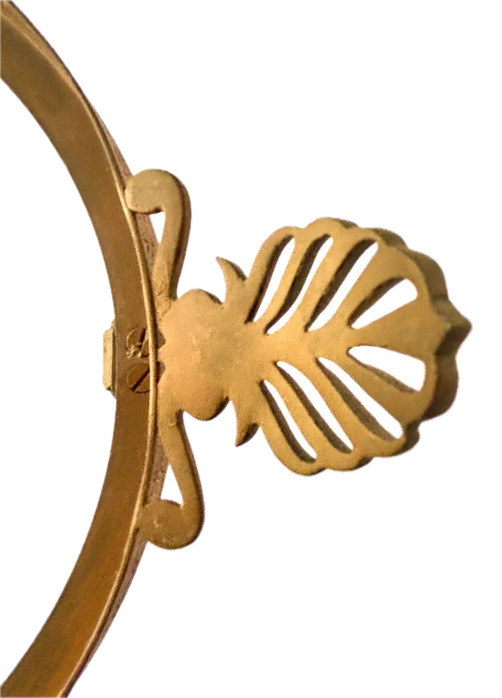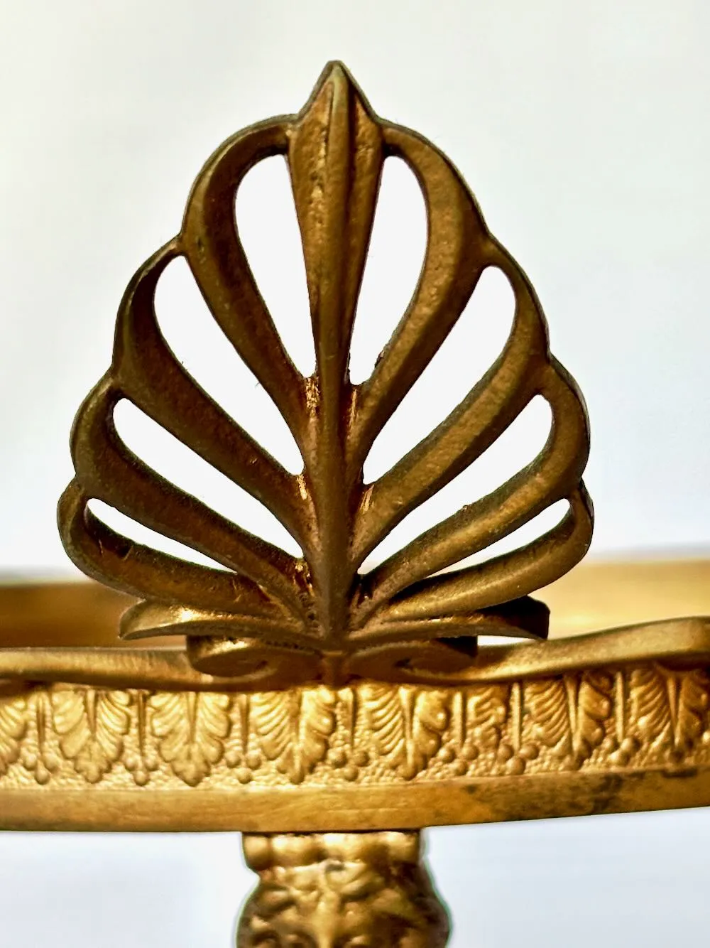 The circular rim is formed in gilt brass and decorated with a continuous acanthus leaf and berry frieze, crisply defined and evenly spaced. Rising from the rim at intervals are three pierced anthemion (palmette) finials, mounted on small brackets and providing vertical articulation to the otherwise horizontal form. The contrast between the heavier cast bronze legs and the lighter, shaped brass elements reflects typical 19th century workshop construction, where components were produced separately and assembled into the finished object.