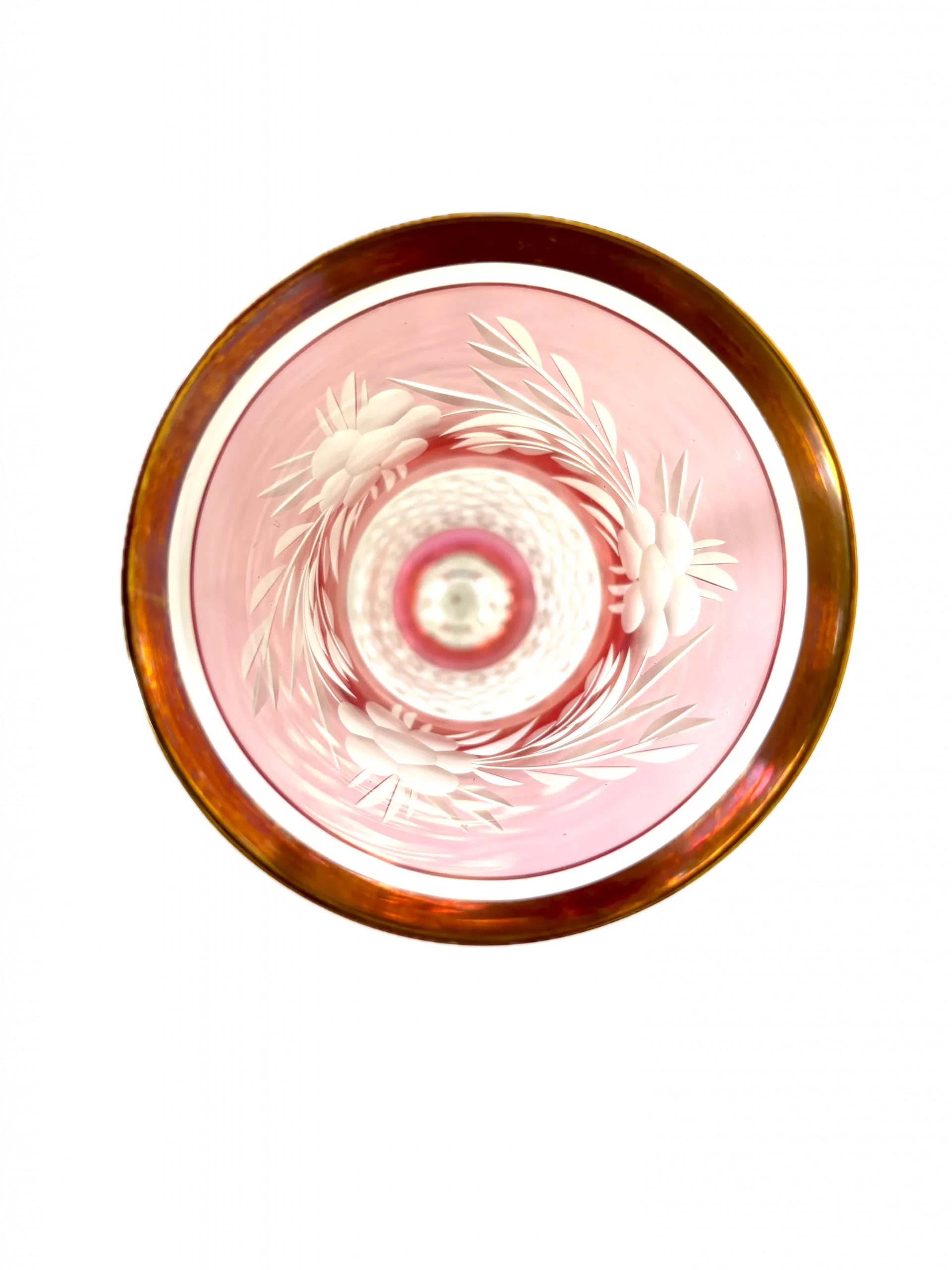 The bowl shows the classic Marchioness floral wheel-cut design, clean and well defined. The lower section reflects light through a crisp diamond-cut pattern, while the gold rim provides a warm contrast against the rose tone. The proportions feel balanced and refined, making it both a functional glass and a display piece.