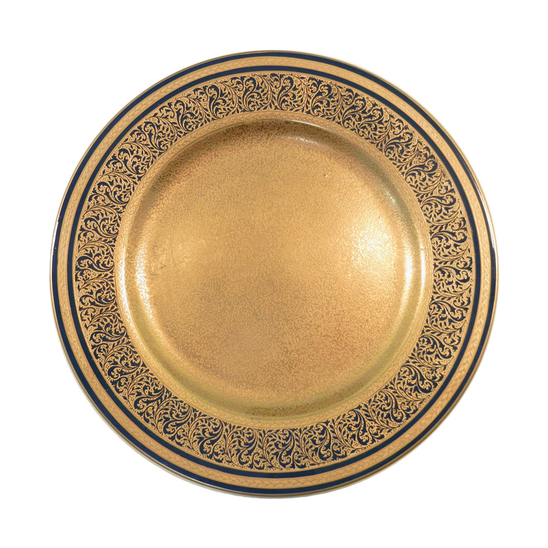 The border features scrolling foliate decoration in gold against a vivid cobalt ground, framed by finely defined gilt bands that give the pattern structure and depth. At the center, the cabinet plates display a beautifully acid-textured, or encrusted, gilt surface. This technique creates a softly granular texture that catches the light differently from smooth gilding, producing a warm, luminous effect and adding a distinct sense of dimension.