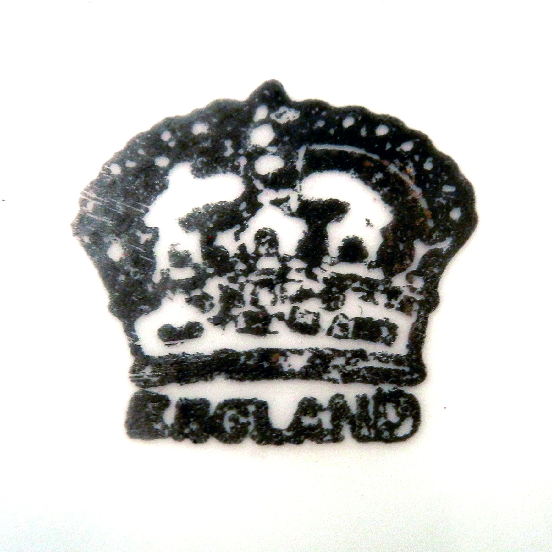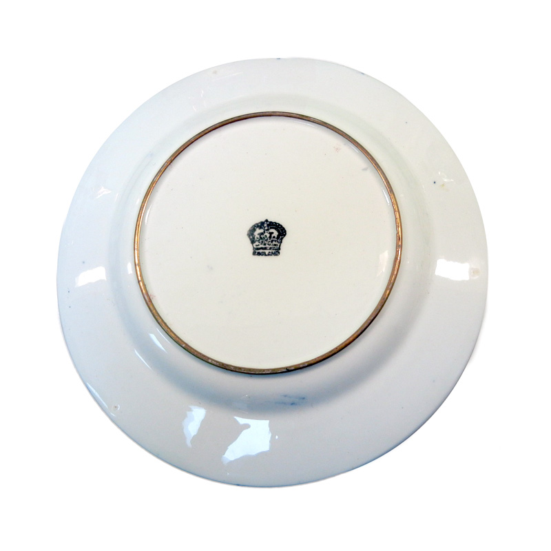 The reverse bears a simple crown mark over ENGLAND, a generic export backstamp used by multiple Staffordshire factories after 1891. Without an impressed factory mark or retailer stamp, the specific maker remains unknown. However, the style aligns closely with the richly gilded cobalt wares produced in Staffordshire during this period, including those made for both domestic use and export markets.