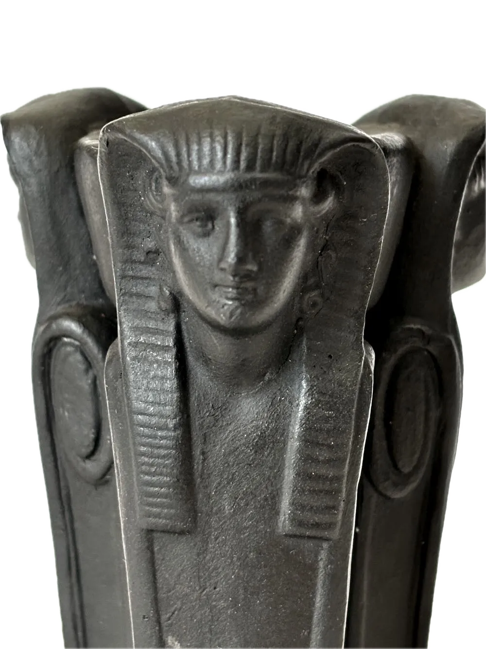The candlestick remains structurally sound, with well-preserved modeling throughout. The absence of the original nozzle is noted, but does not detract from the piece’s strong sculptural presence and rarity as an early Wedgwood Egyptian form.
