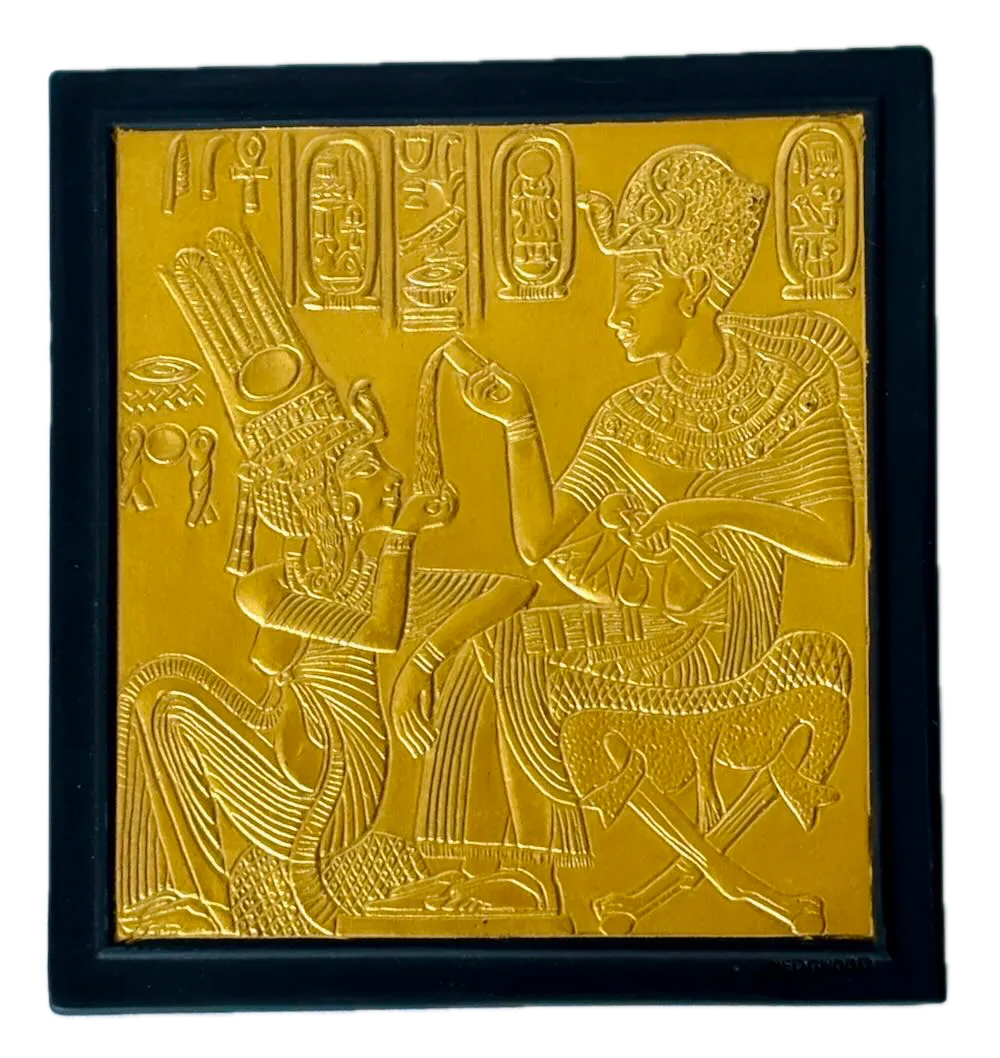 Executed in Wedgwood’s iconic black basalt, the plaque is adorned with a finely rendered 24K gold relief depicting a sacred scene from the golden shrine of Tutankhamun’s tomb. The young pharaoh is shown seated while Queen Ankhesenamun gently anoints him, surrounded by stylized hieroglyphic cartouches—an intimate and symbolic moment drawn directly from one of the most remarkable archaeological discoveries of the 20th century.