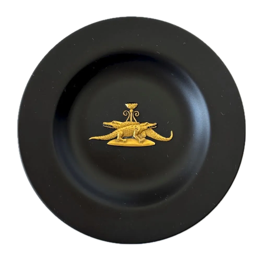 This is a Wedgwood Egyptian Collection small crocodile plate in black basalt with applied gilt decoration, produced in England in the late 1970s. At this scale, the piece reads more as an object of design than tableware—a compact, focused composition where material, color, and symbolism work together with clarity.